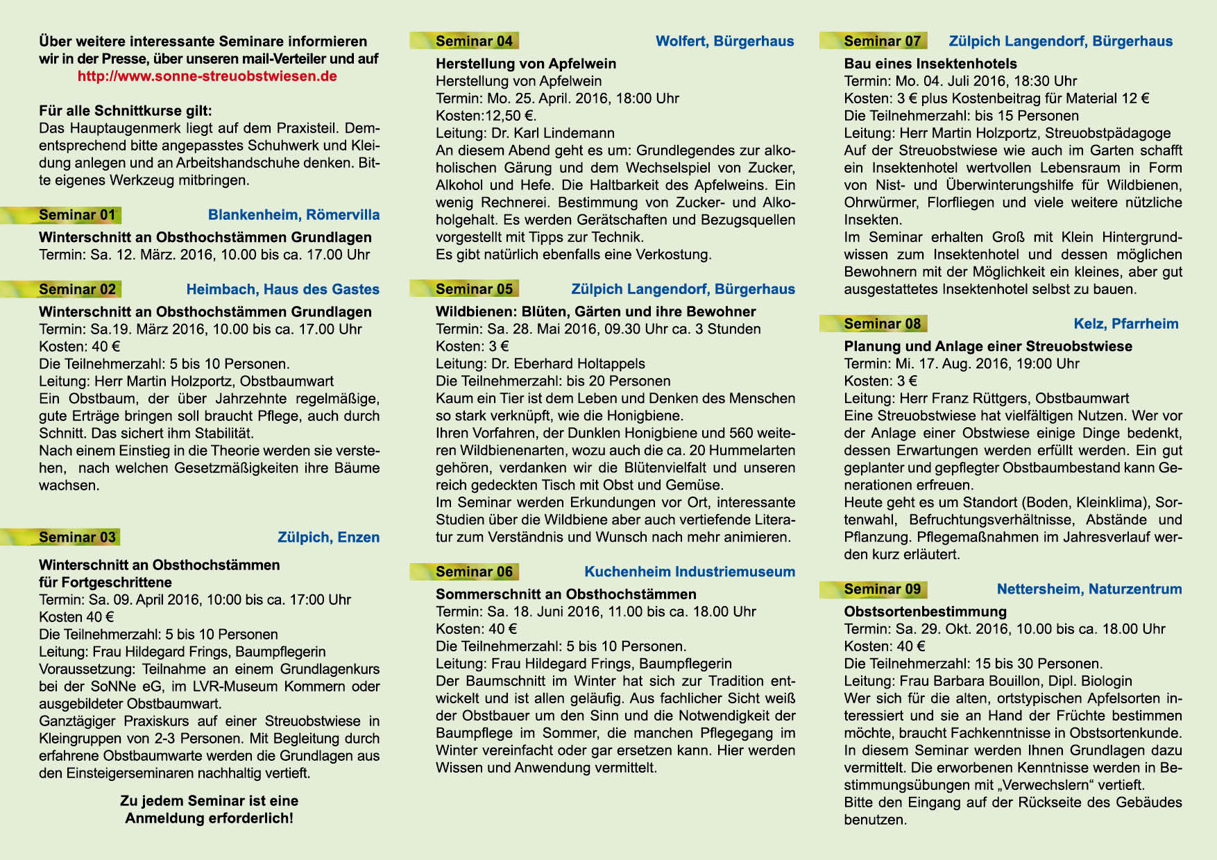 Unter "Termine" finden sie nähere Informationen zu den soNNigen Fortbildungsmöglichkeiten rund um die Streuobstwiese und hier das komplette Seminarprogramm 2016.